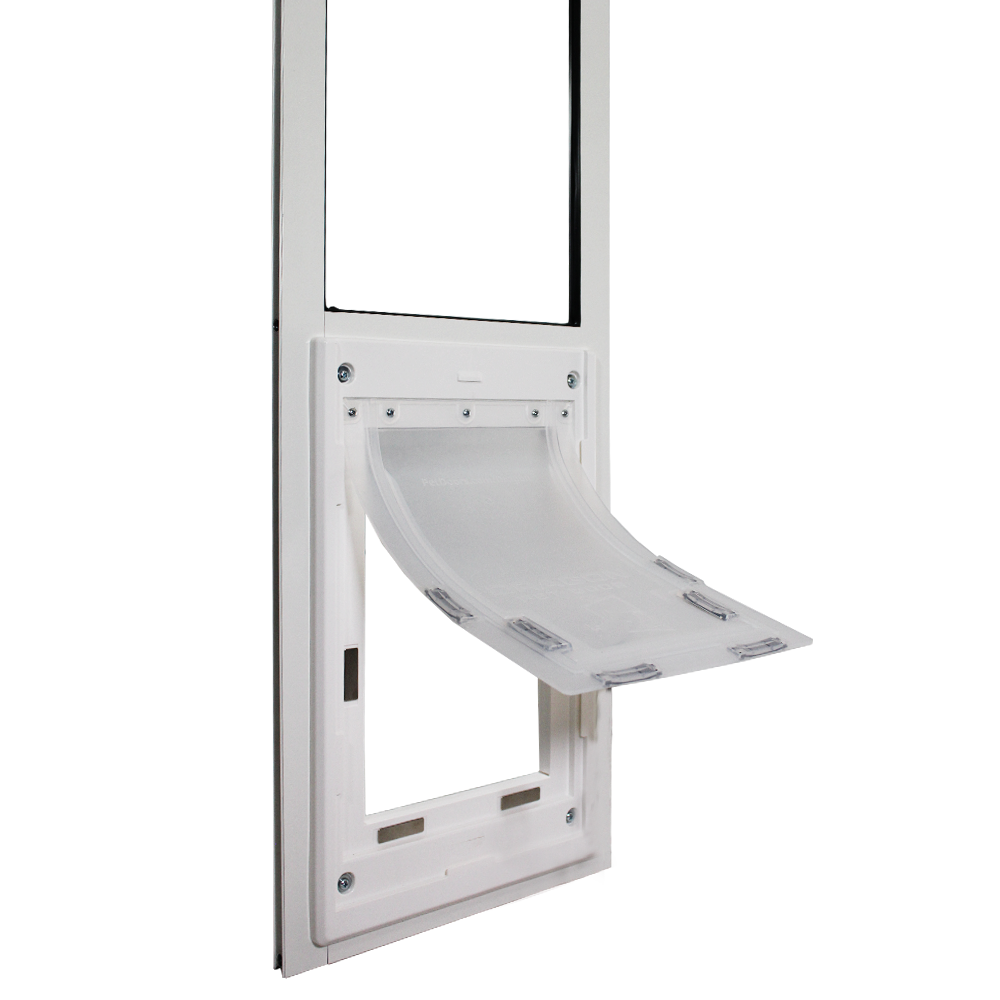 The Dragon patio panel pet door for aluminum sliding glass doors (also available in double flap) is made to complement your existing sliding door frame. This removable panel with a built-in Dragon pet door is an economically friendly solution for installing a pet door in a sliding glass door. You can remove the panel in a matter of minutes, making it the ideal choice for vacation homes and rental properties. There are other installation types for the Dragon Pet Door. Already have a Dragon pet door? See which replacement flap fits your door.