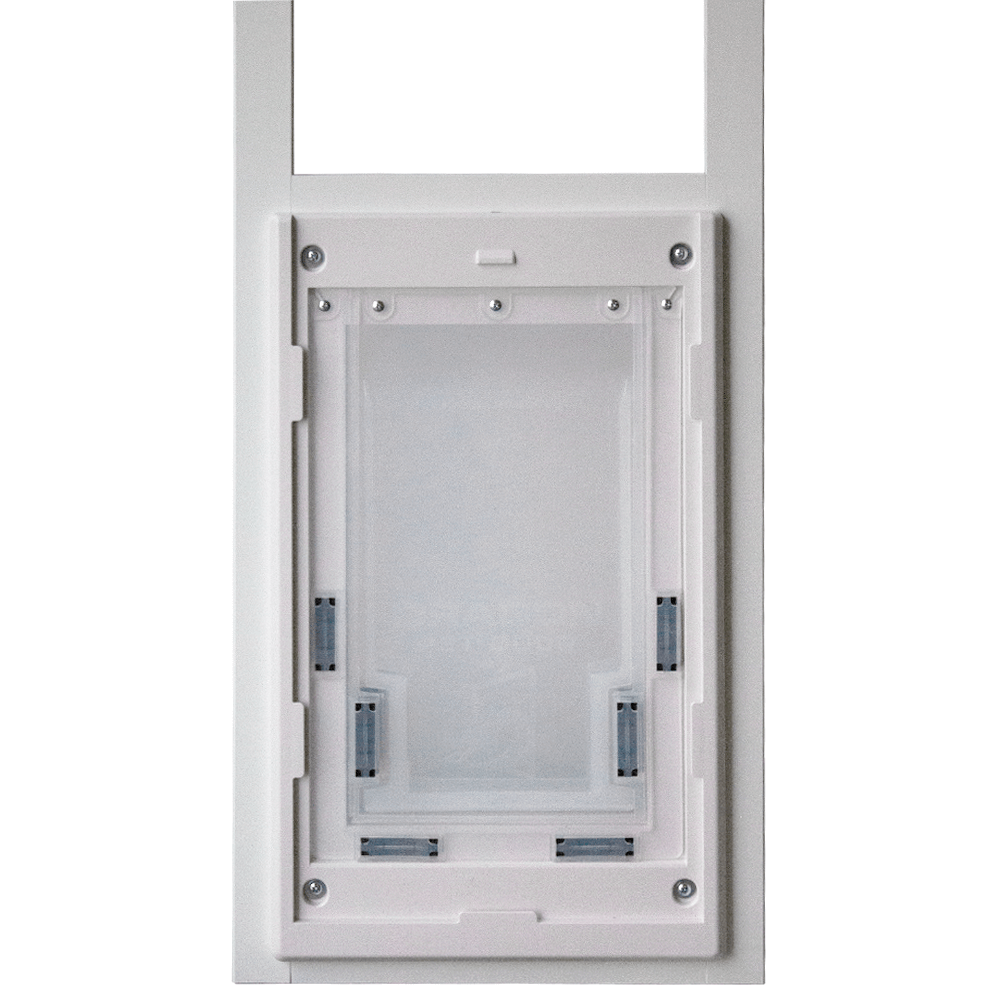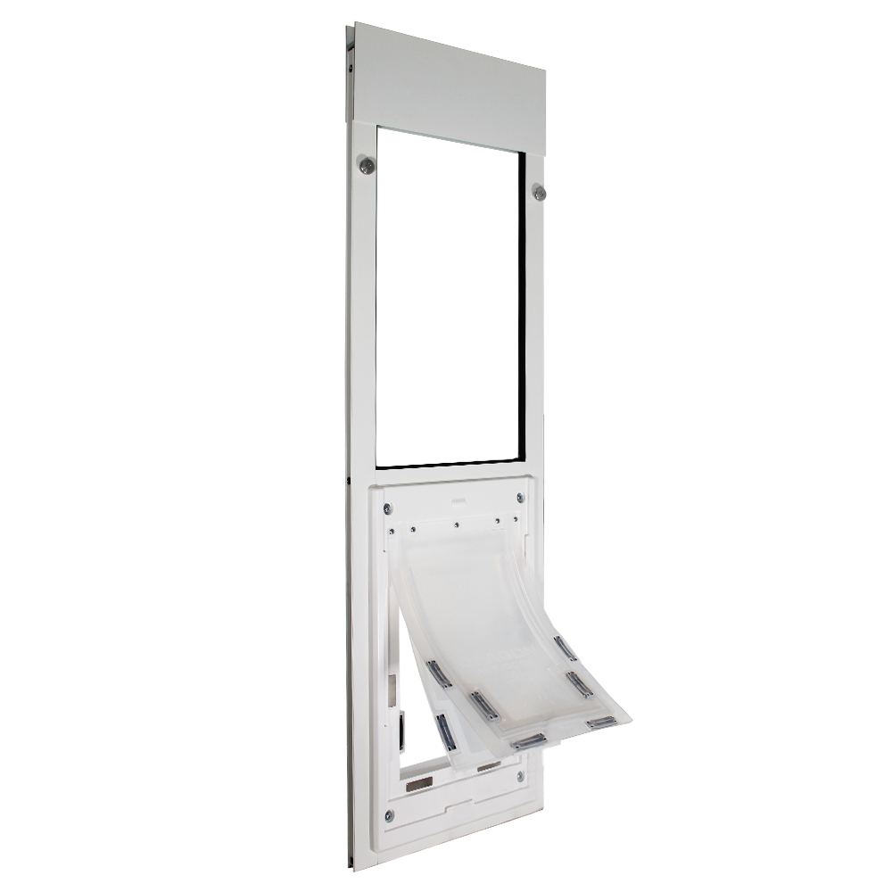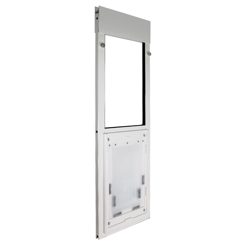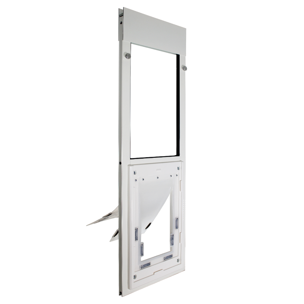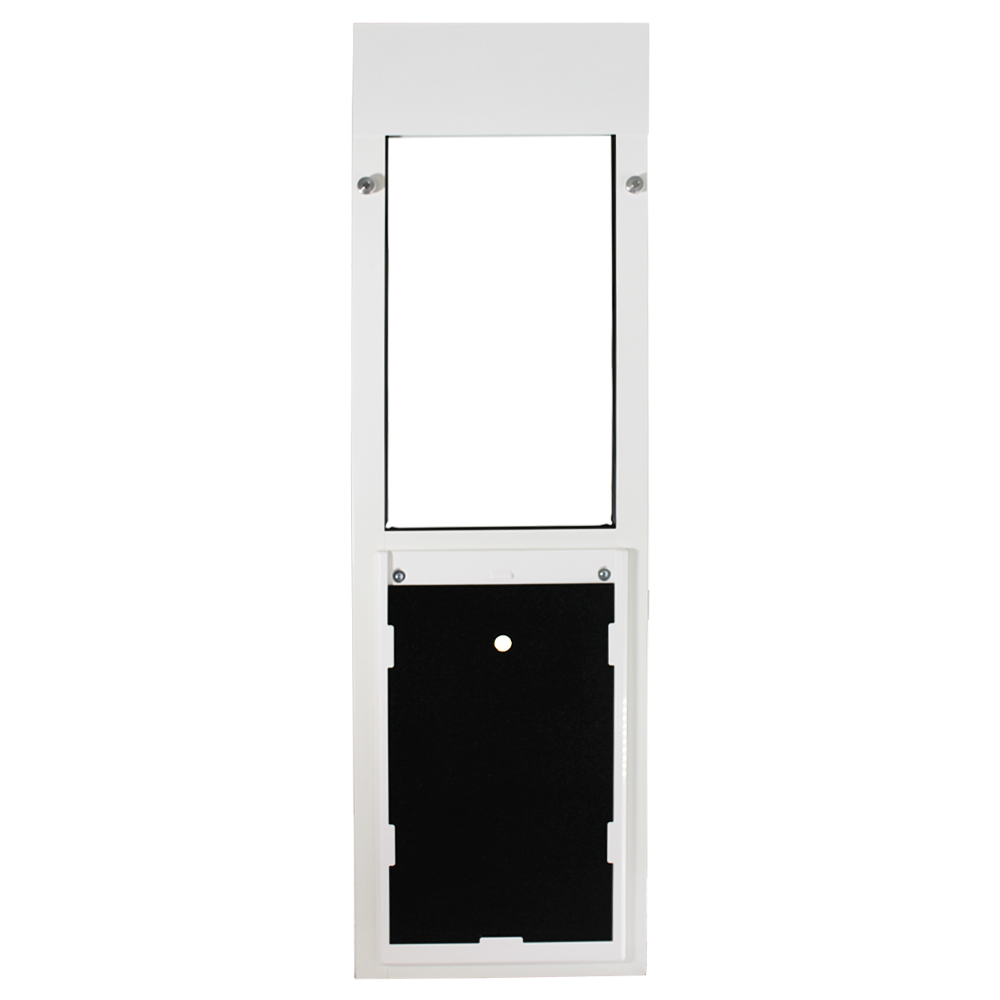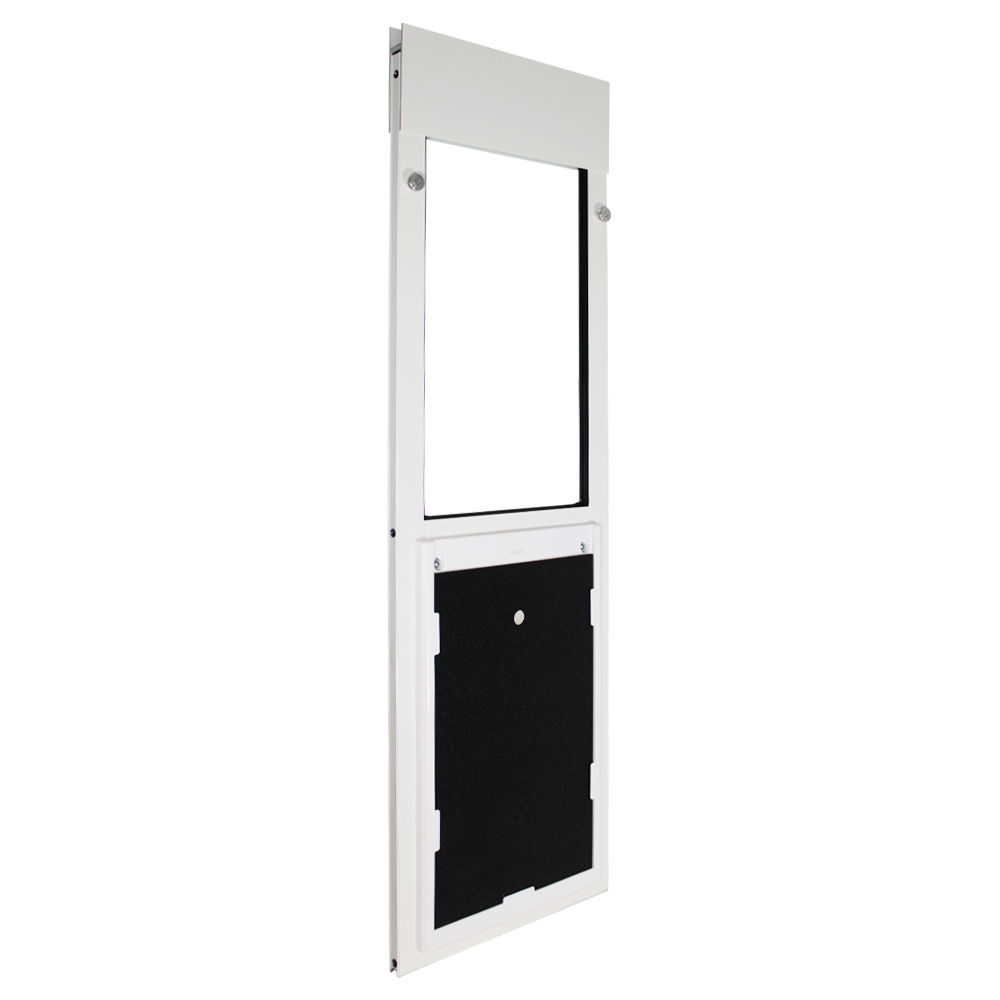 - Sturdy panel insert with built-in pet door for side-sliding windows