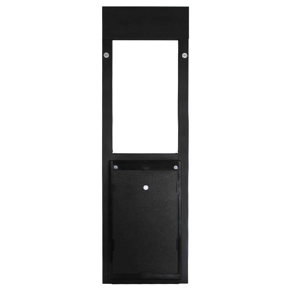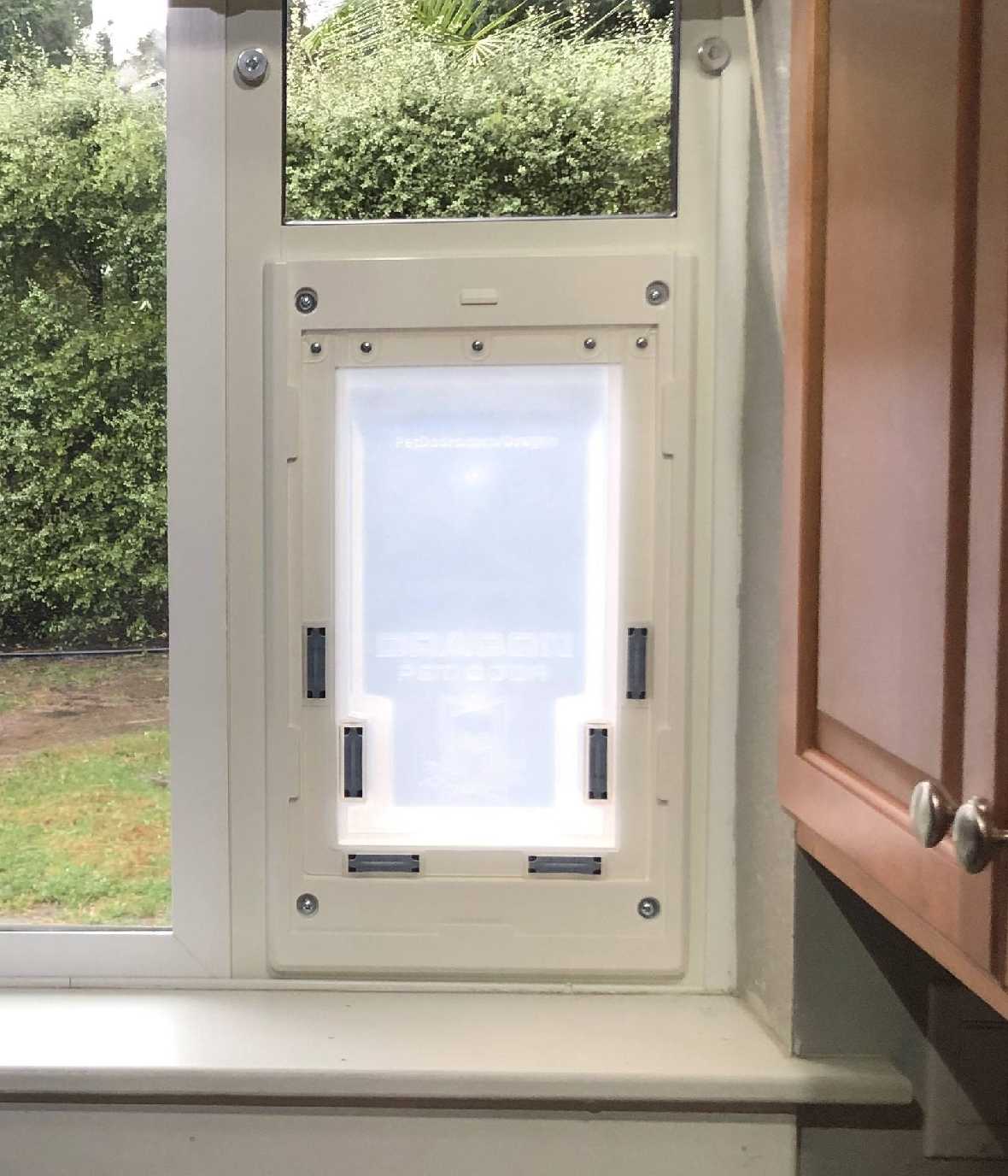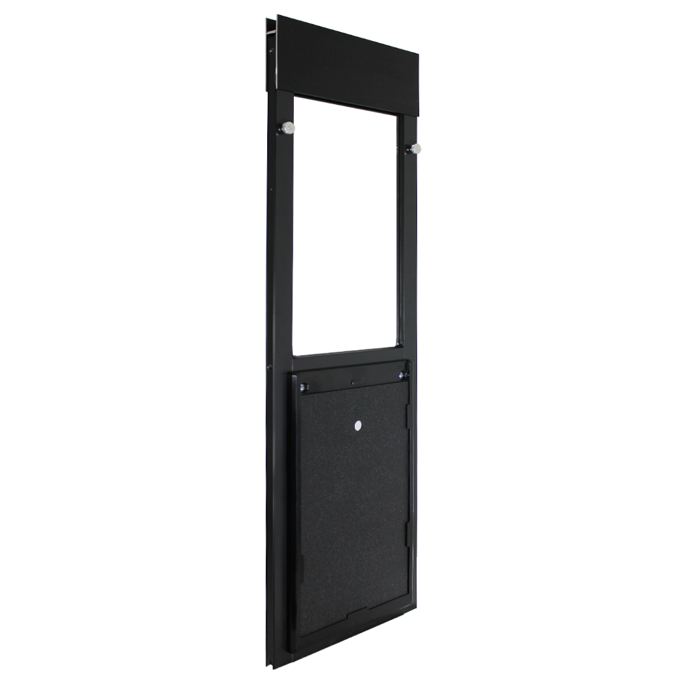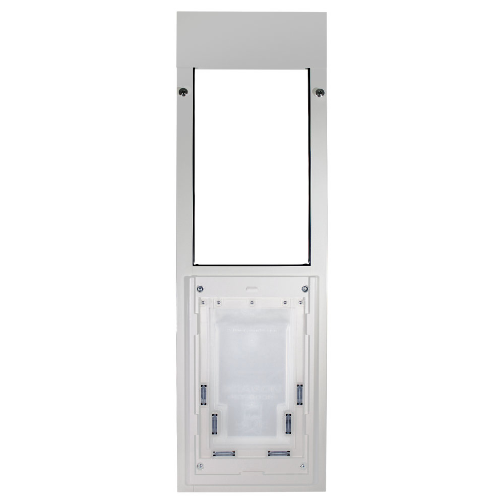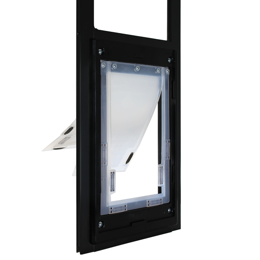 - Sturdy panel insert with built-in pet door for side-sliding windows