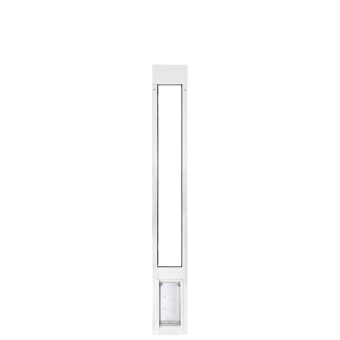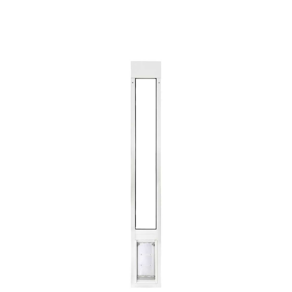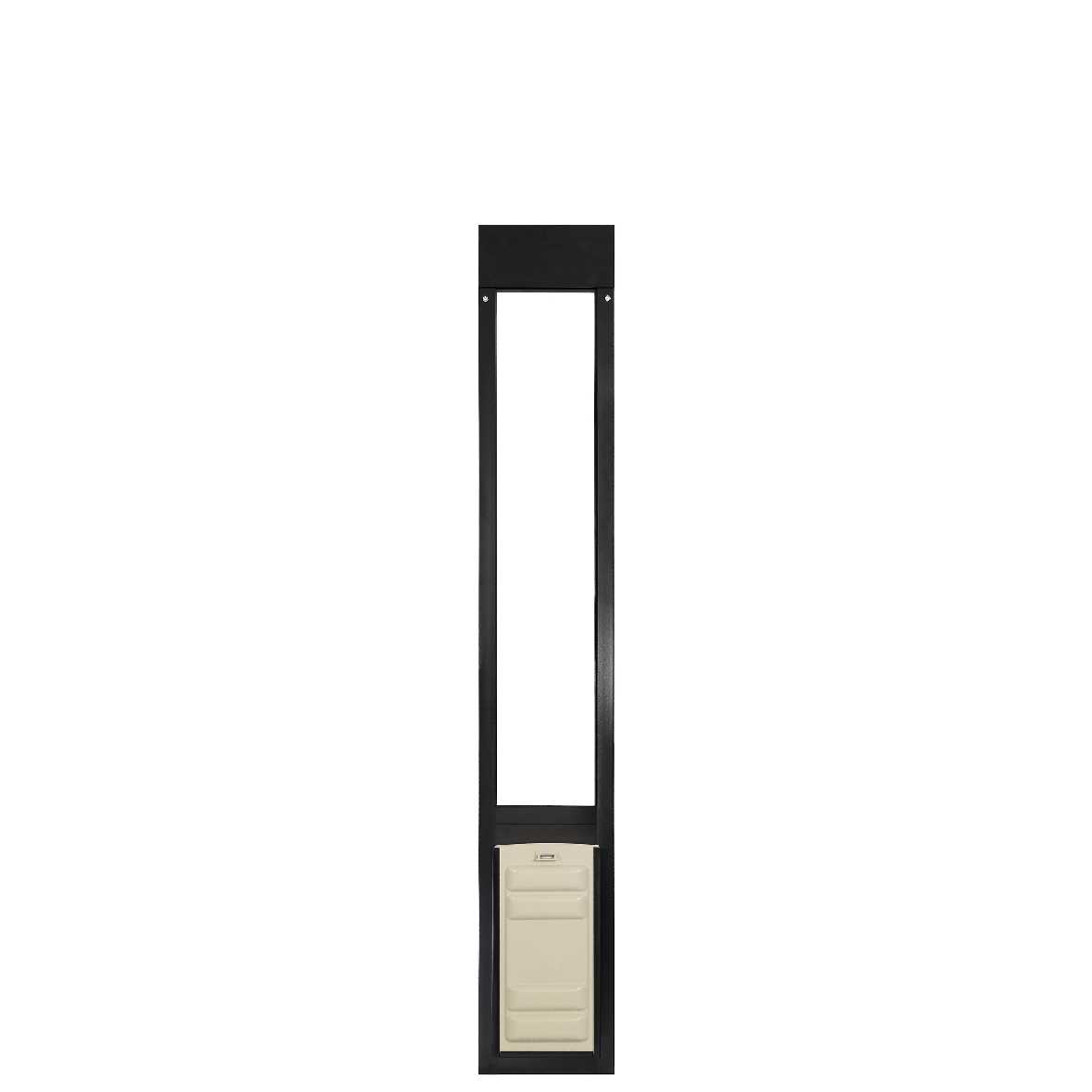 - Aluminum frame pet door designed for sliding glass doors with a minimum track thickness of once inch
