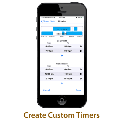 - Set up to 20 custom timers to control when your pet can go outside. If your pet is outside when the timer activates (turns off the inside sensor only) they will still be able to come in because the outside sensor will let them in