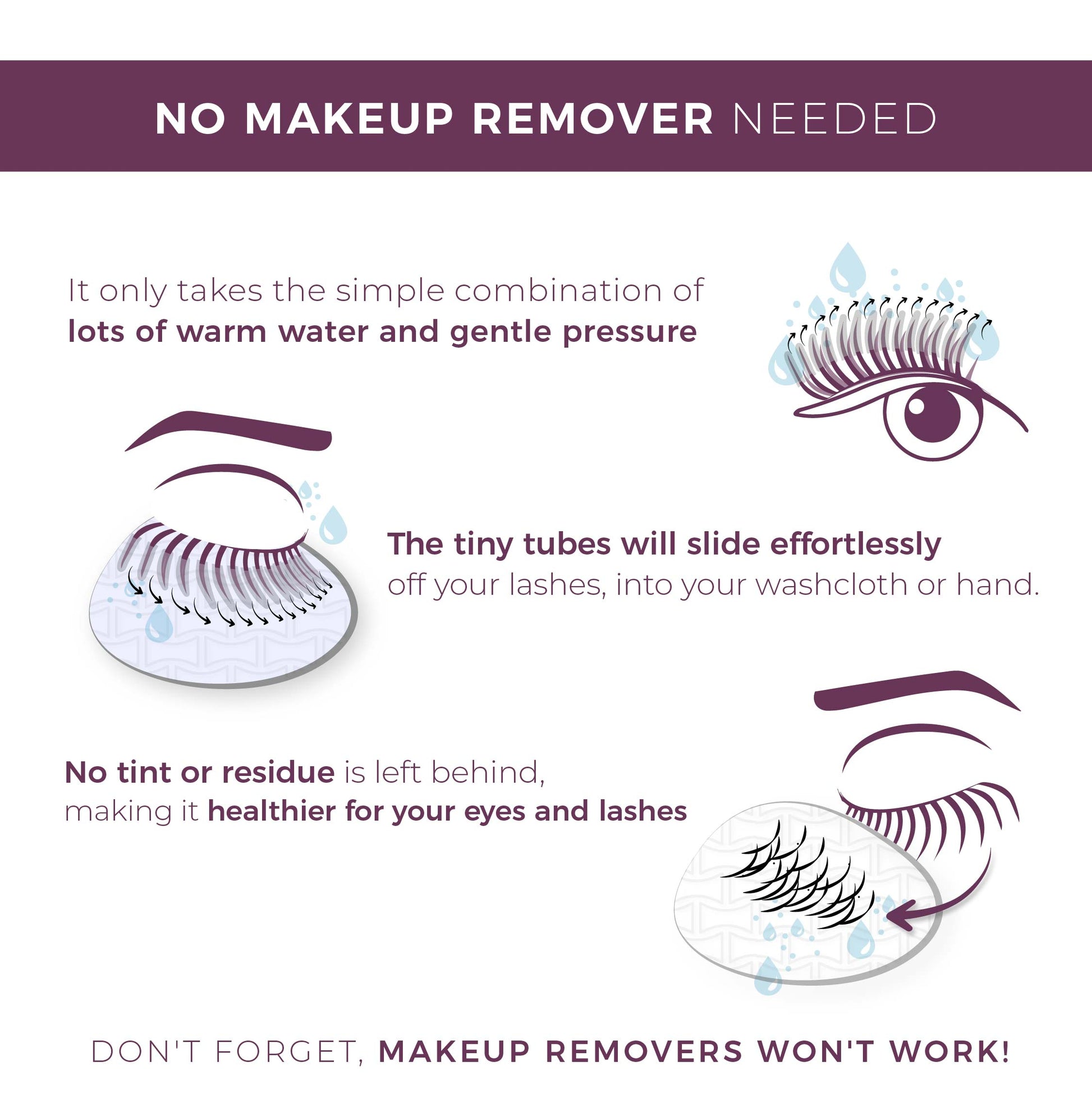 Better hold than waterproof mascaras, yet easier to remove. Just the simple combination of lots of warm water and gentle pressure will slide the tiny tubes effortlessly off your lashes, into your washcloth or hand. No tint or residue is left behind, making it healthier for your eyes and lashes. Don't forget, makeup removers won't work.